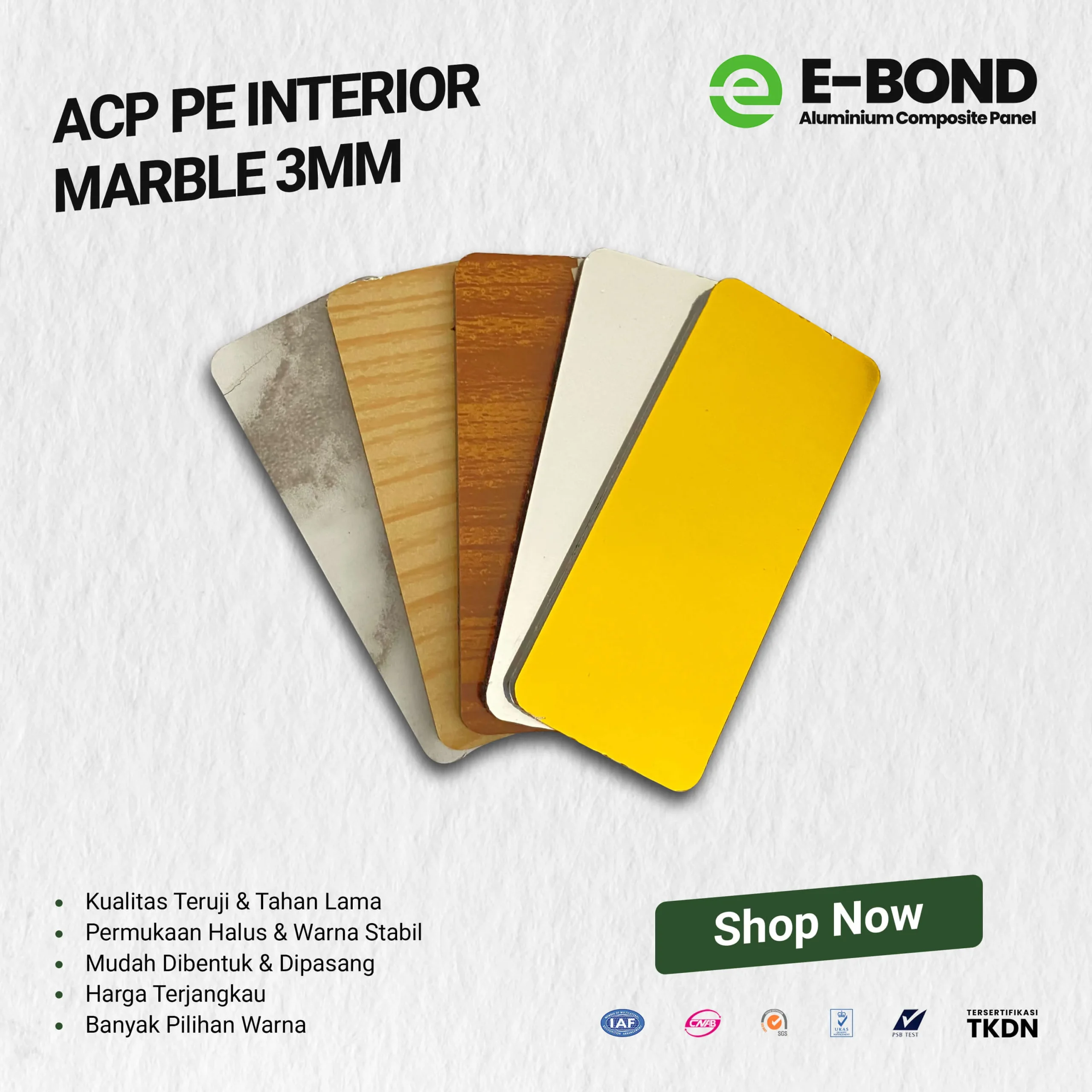 Tertarik untuk menciptakan desain interior bangunan yang keren dan menarik? Bagi Anda yang notabene merupakan arsitek, developer maupun perorangan, wujudkan interior keren Anda dengan ACP Ebond, merk ACP terbaik kualitas terpercaya. ACP Ebond hadir dengan banyak pilihan warna dan corak yang menarik, tentunya sangat cocok bagi Anda yang ingin membuat interior ruangan yang keren dan menarik sesuai kreatifitas. Pada umumnya, pemanfaatan ACP Ebond ini digunakan untuk beberapa hal termasuk diantaranya pada seperti interior gedung perkantoran, hotel, showroom hingga perumahan.